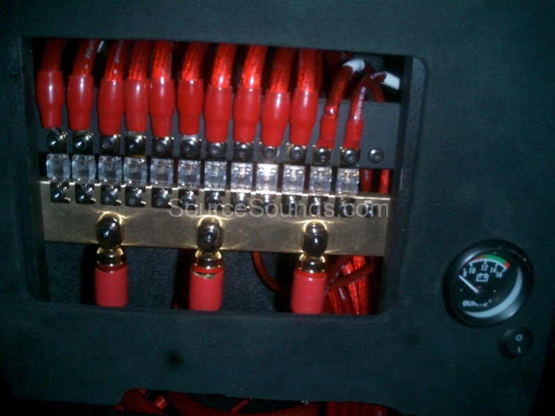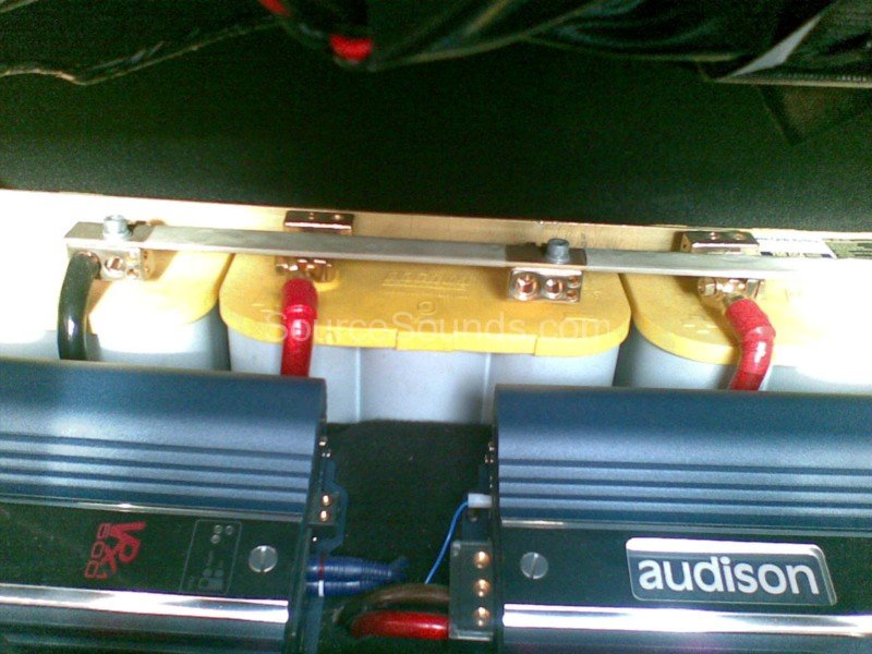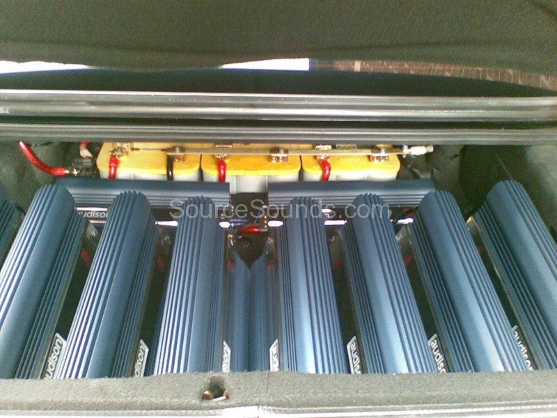 The customer loves bass, so we put our heads together and came up with a wall of 5x 13″ Focal K2P subwoofers. These subs had 2 amplifiers to power each one of them, giving a total of 10x Audison VRx monoblock amplifiers just for bass. When you consider that each amp (when fully loaded) will draw 250a of current EACH, you can imagine how much power they produce! To power all these monster amps we custom built a power distribution system which took power from 3x Optima Yellow Top batteries. The front end we used were a set of Focal 130KP 5.25″ component speakers and these were run through a Rockford Fosgate Symmetry equaliser for individual frequency adjustment.
