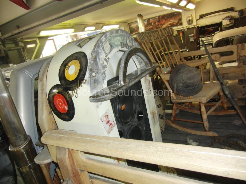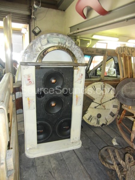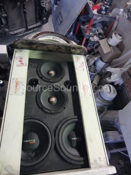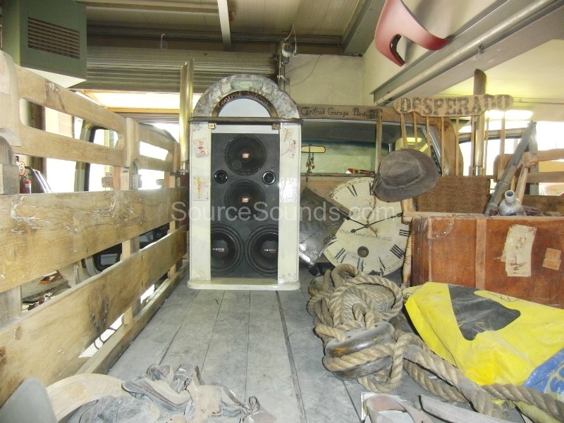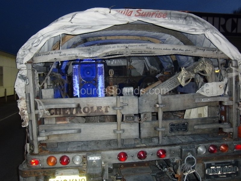 We built a ‘Juke-Box’ for the rear of this Chevrolet truck, called ‘Desperado’ by the builder. It houses 2x 10″ Hertz subwoofers and a set of Hertz SPL Show mids and tweeters. The Juke Box suits the vehicle perfectly as it is a very wild construction.