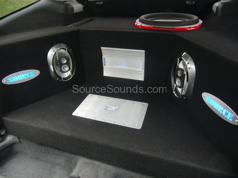 Trying to shoe-horn a bass heavy subwoofer into a very small car doesn’t often work.  On this car we removed the back seats to get enough space for 2 amplifiers and a pair of 6″ x 9″ speakers to be fitted in the rear.  We changed the factory cd player for an Alpine flip out motorised monitor that was touch screen and gave iPod connectivity.