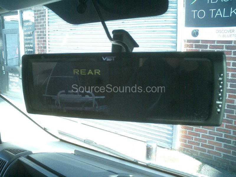 The addition of a reverse camera onto a rear view mirror screen. The mirror works ok as a normal rear view mirror, but when put into reverse it activates the screen part and the reverse image pops up onto the screen.