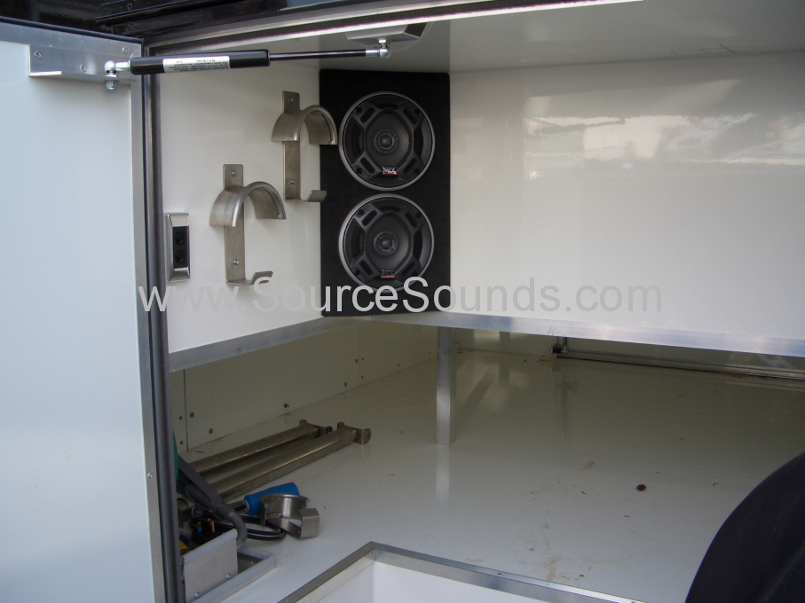 With some horse events being a little long, this customer required some entertainment whilst saddling and waiting around.  We custom mounted an Alpine stereo with some MTX coaxial speakers in the saddle storage area of this beautiful horse box.