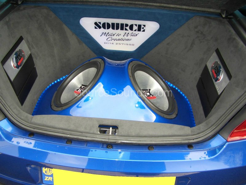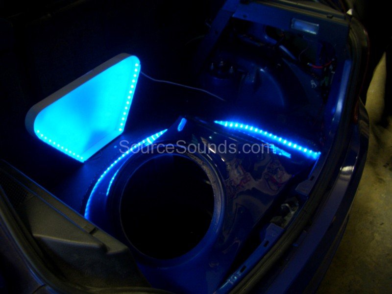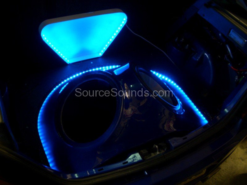Custom boot install for 2 x MTX 12″ subwoofers powered from an MTX mono amplifier.  The other amplifier, an MTX 2 channel amp powers the front MTX component speakers.   The box was painted and lit with blue LED’s for that extra special touch.