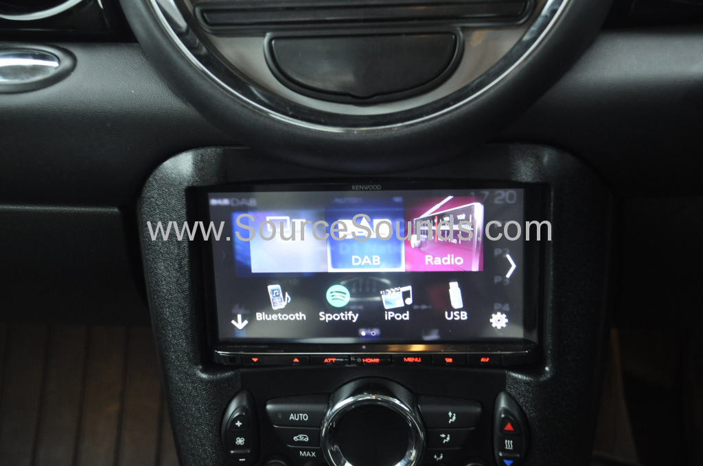 The supply and install of a Kenwood DMX7017DABS. This system is a 2012 Mini Cooper DAB upgrade.  The unit features a 7″ LCD touch panel. This controls features such as DAB radio, Bluetooth phone calls and music streaming, as well as Apple Car Play and iPod connectivity.