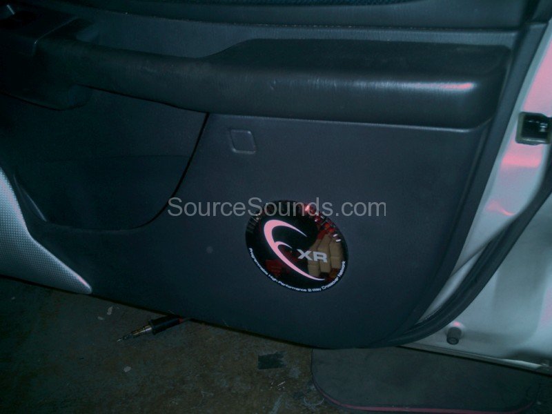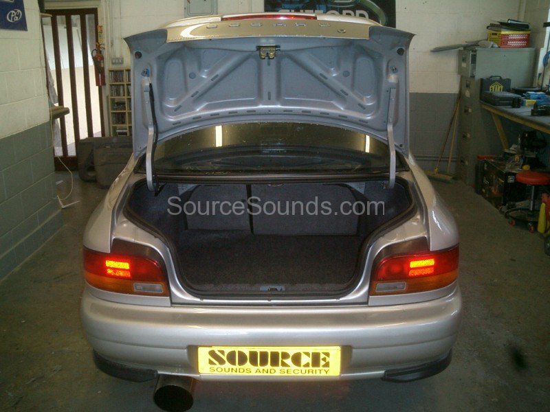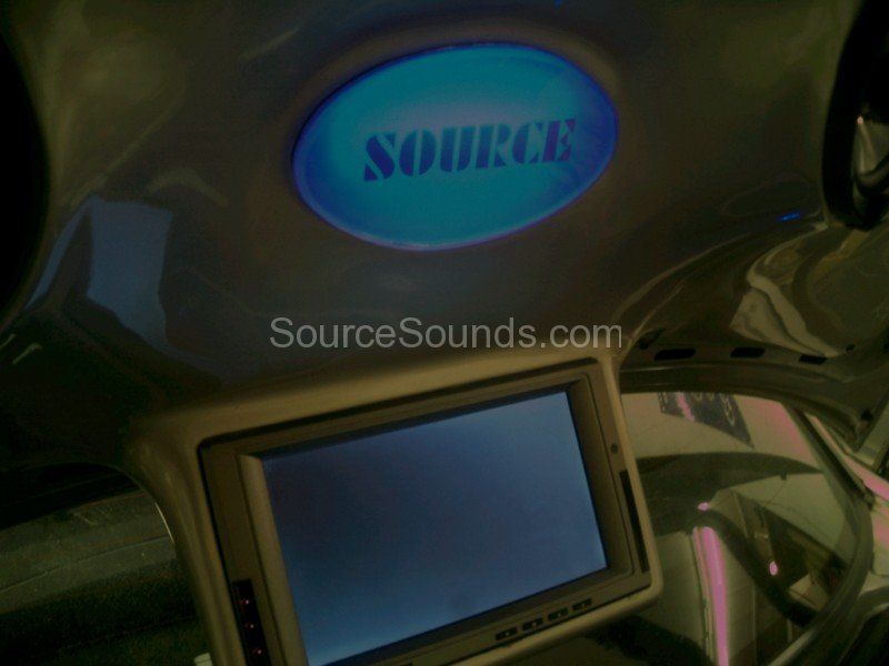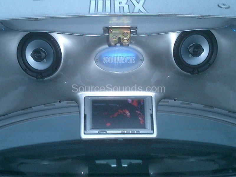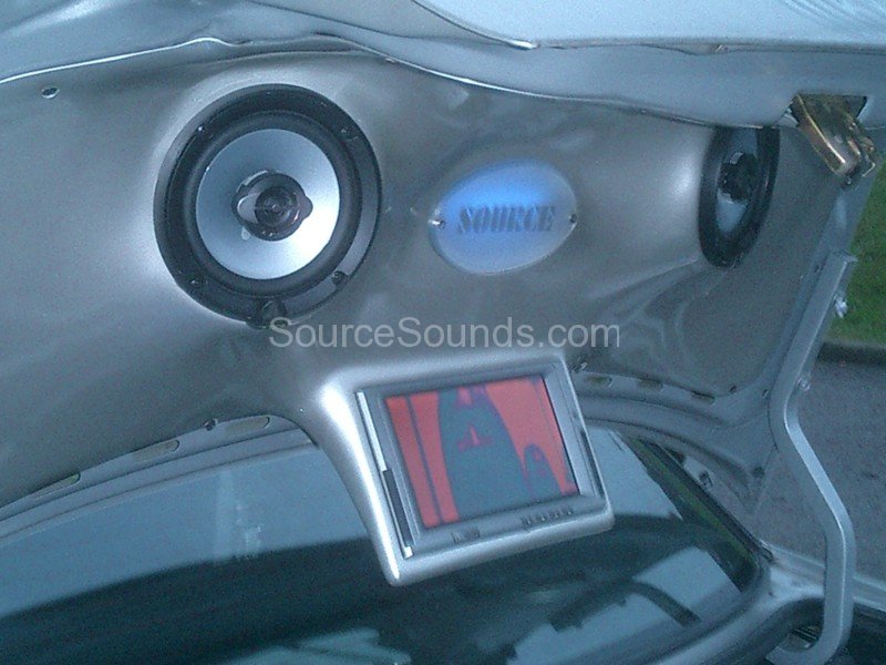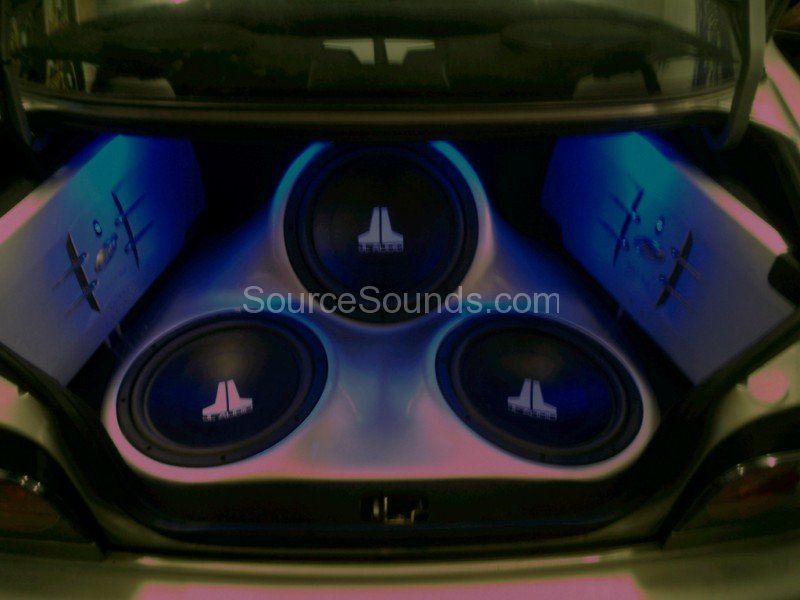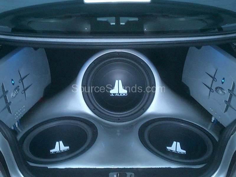 Custom painted boot install of JL Audio subwoofers, Phoenix Gold Xenon amplifiers, JL Audio front component speakers, motorised DVD stereo and boot lid mounted 9″ screen linked to the front DVD player.